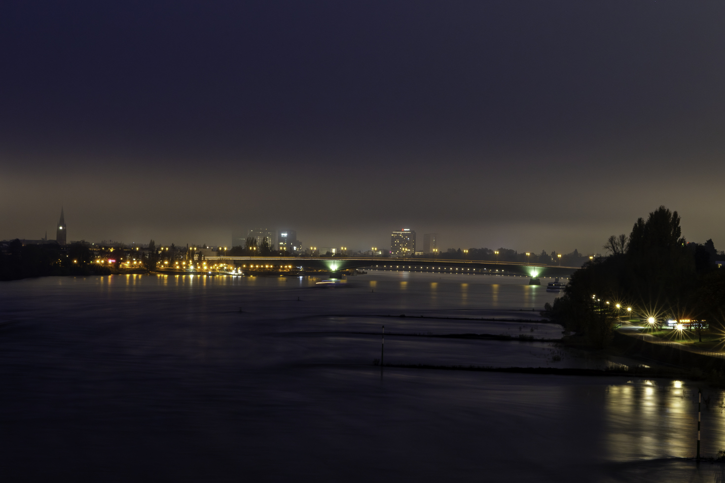 Auf selbiger Brücke stand ich nun gestern Morgen mittig des Rheins und hatte auf einen schönen Sonnenaufgang gehofft. In den letzten Tagen hatte es immer ein buntes Farbenspiel zu Tagesbeginn gegeben. Gestern dann leider nicht. Ein recht warmer Tag und eine kühle wolkenfreie Nacht sind tolle Voraussetzungen für einen Nebelmorgen.