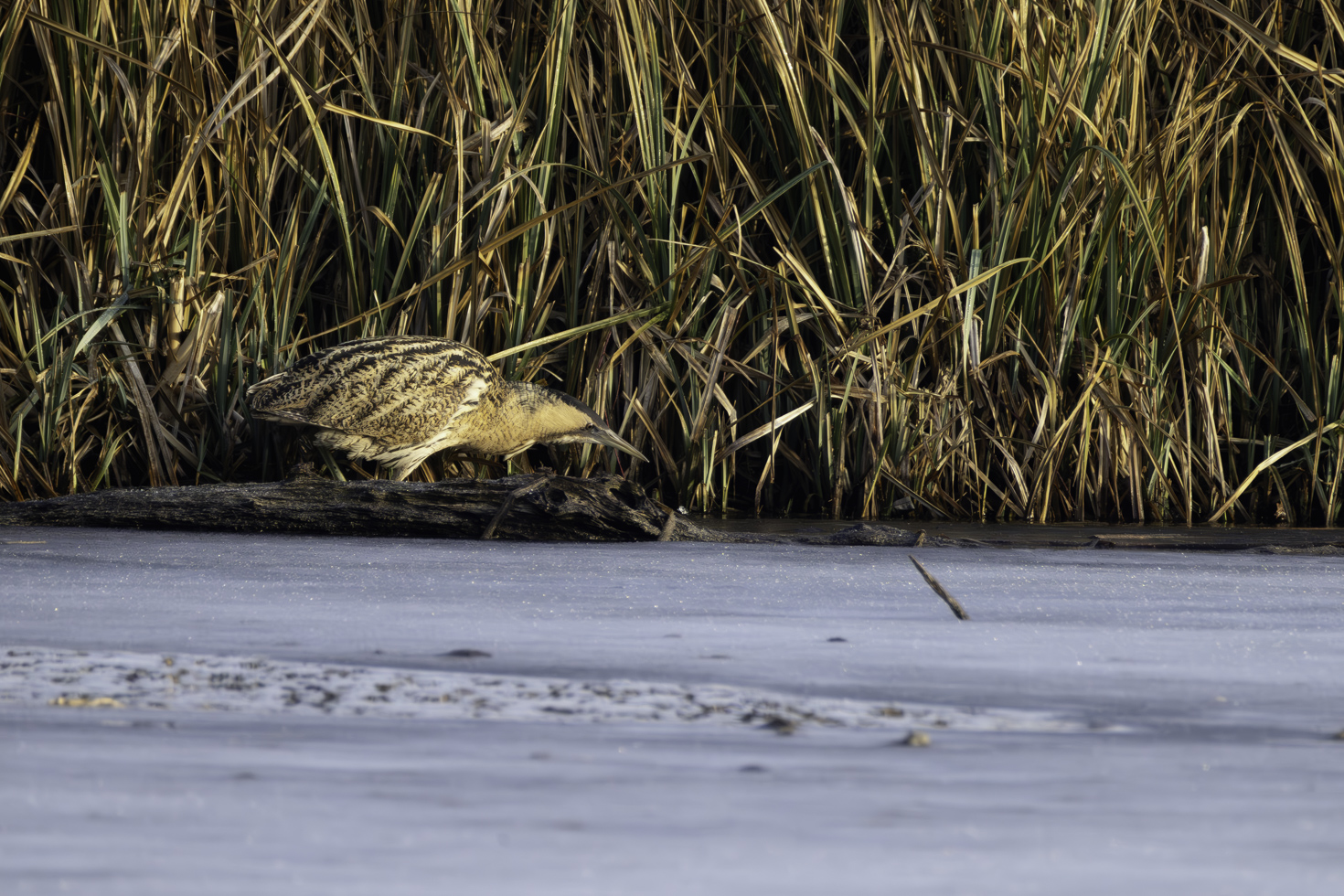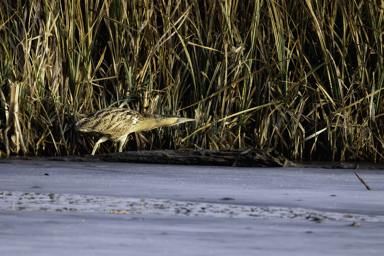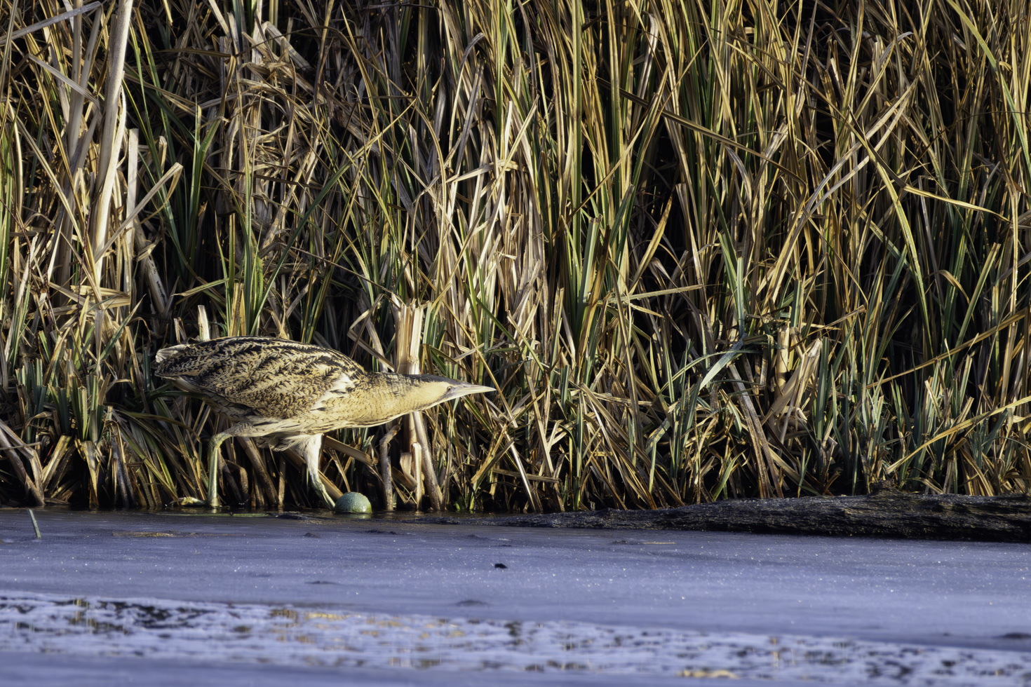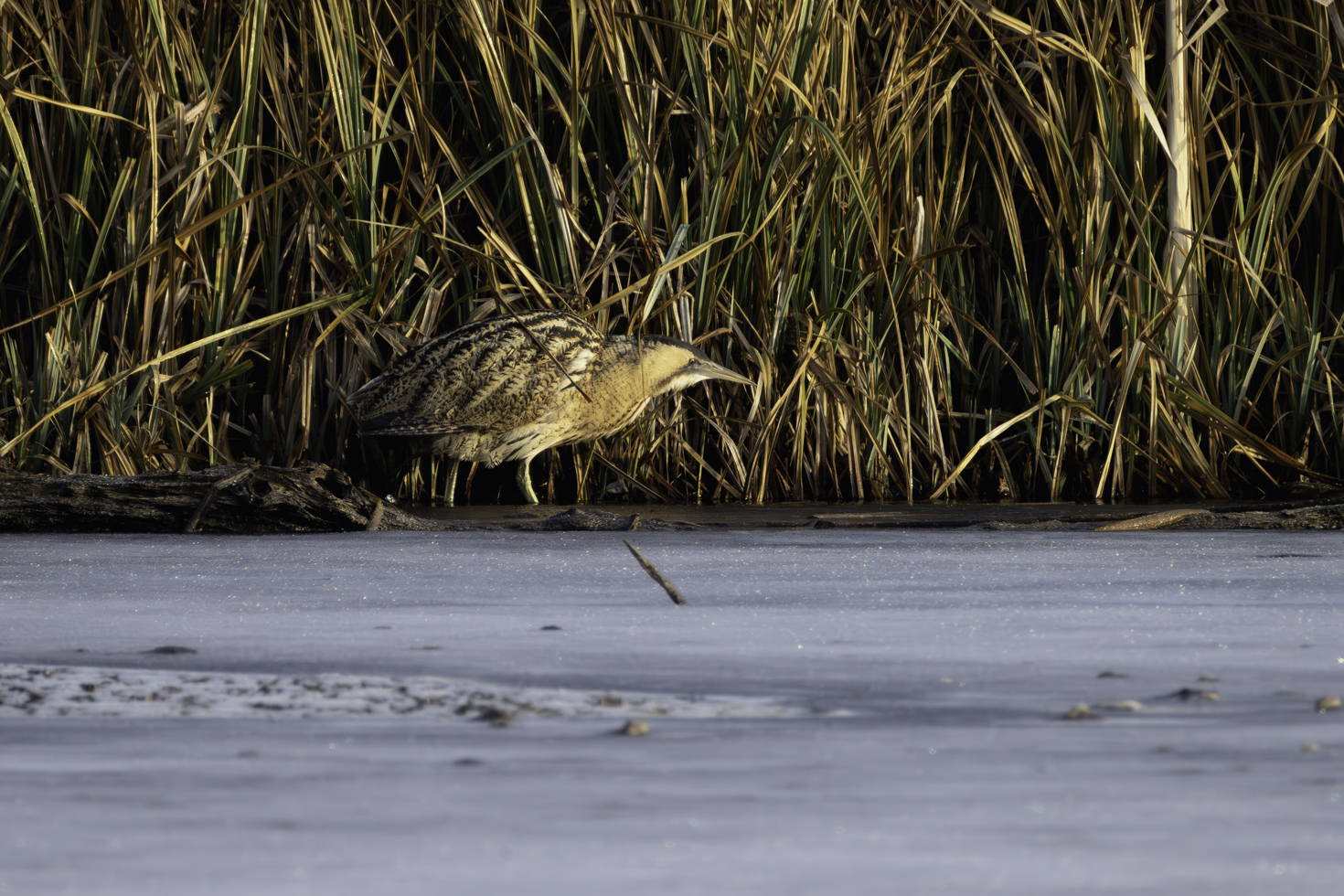Etwa eine Stunde hat es gedauert bis die erste Rohrdommel aus dem Schilfrohr trat und sich zeigte. Und ganz nach Rohrdommelmanier ging es dann im Schneckentempo in ihrem typischen Schreitgang immer am Uferrand entlang durch den kleinen nicht gefrorenen Ufersstreifen, um nach Fischen Ausschau zu halten. Einen Fisch konnte sie auch tatsächlich erbeuten. Die Bilder davon sind aber leider nix geworden.