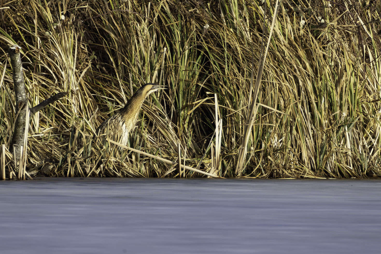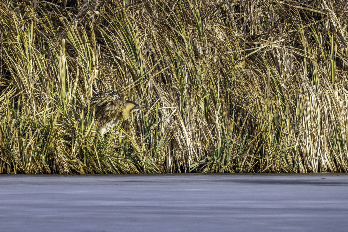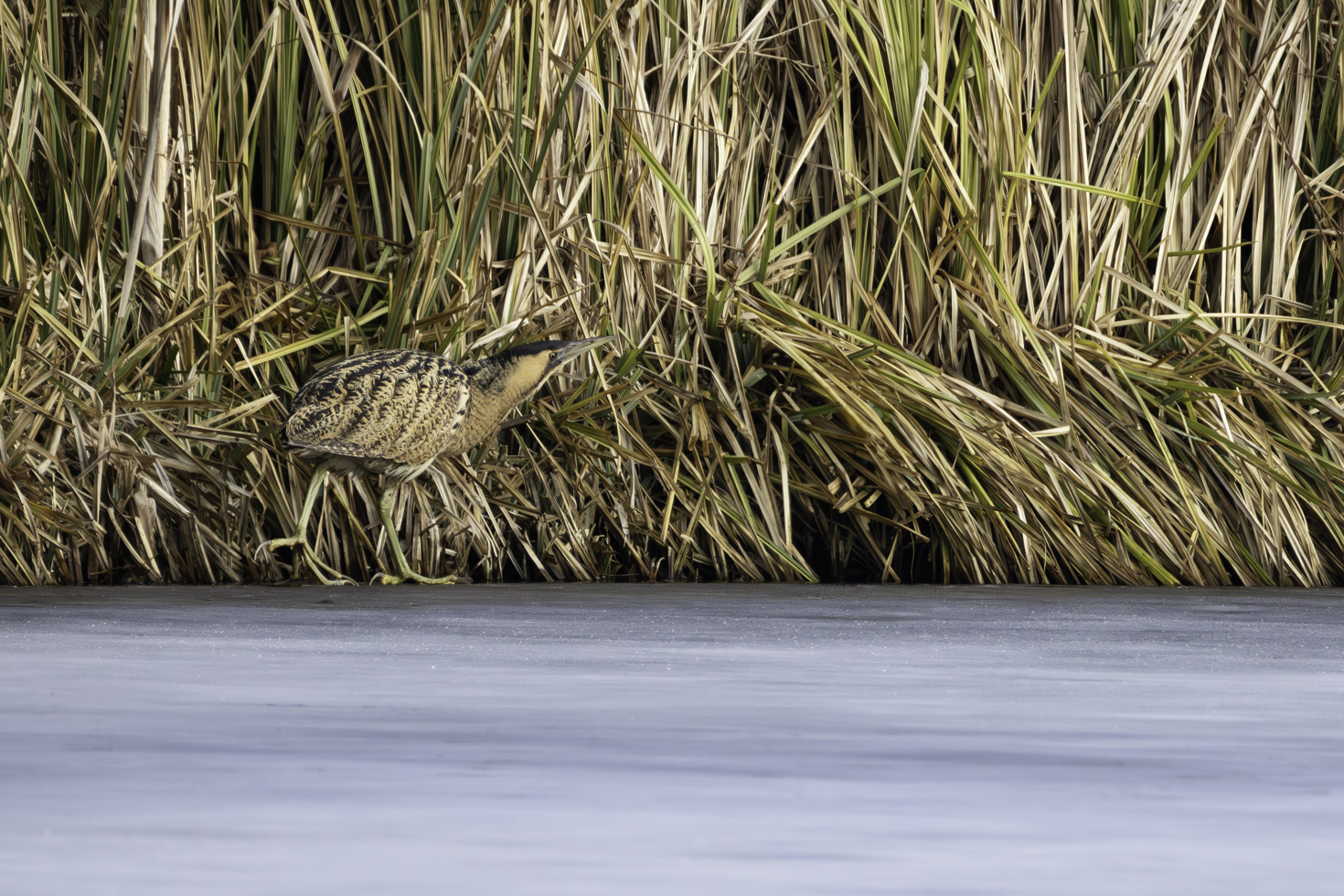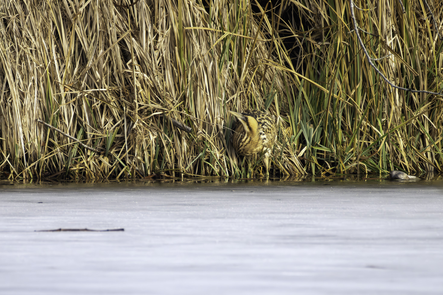 Etwa eine Stunde hat es gedauert bis die erste Rohrdommel aus dem Schilfrohr trat und sich zeigte. Und ganz nach Rohrdommelmanier ging es dann im Schneckentempo in ihrem typischen Schreitgang immer am Uferrand entlang durch den kleinen nicht gefrorenen Ufersstreifen, um nach Fischen Ausschau zu halten. Einen Fisch konnte sie auch tatsächlich erbeuten. Die Bilder davon sind aber leider nix geworden.