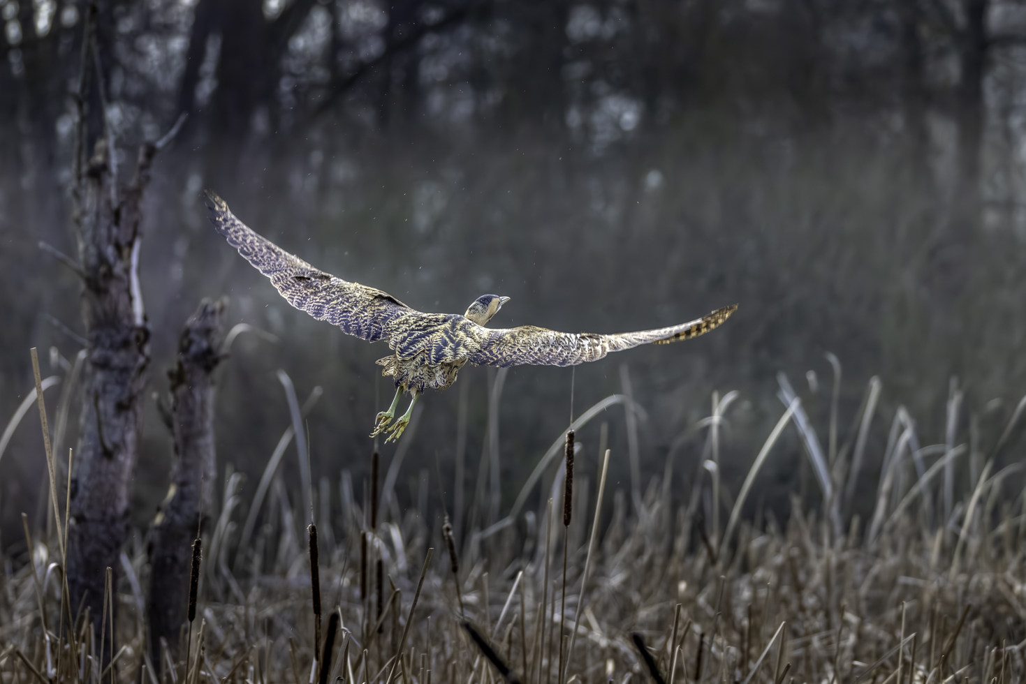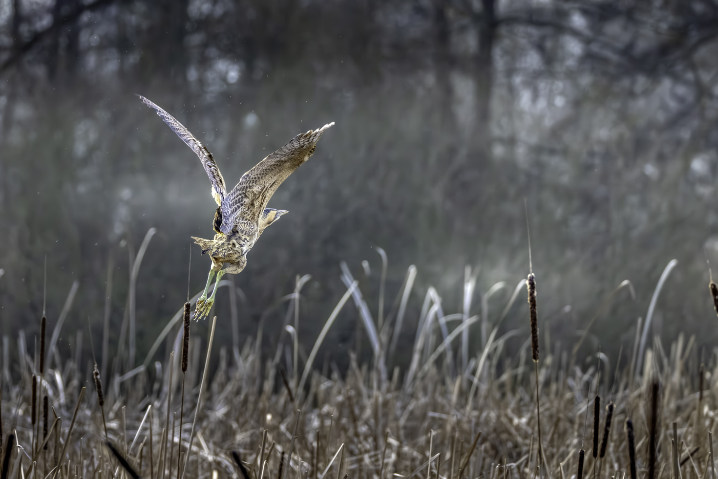 Es dauerte nur einen Augenblick bis die Rohrdommel die Flucht ergriff und aufflog, um sich im hinteren Teil des Teiches im Röhricht wieder nieder zu lassen. Das Ganze dauerte noch nicht einmal 10 Sekunden.