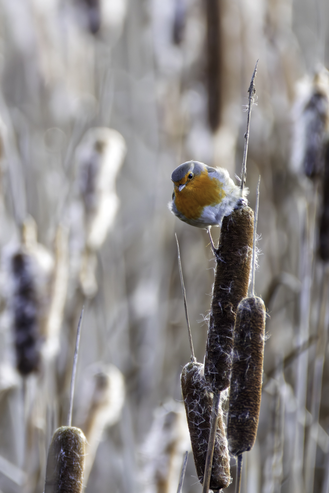 Ein Sprung Rehe aus 10 Tieren lag in weiter Ferne auf einem Feld und am großen Teich war auch leider nichts los. Und der Fuchs, der kurz vorher von einem Mitfotografen im Schilfröhricht gesehen worden war, ließ sich auch nicht mehr blicken. Dafür gab es wieder Rotkehlchen an Schilfkolben.
